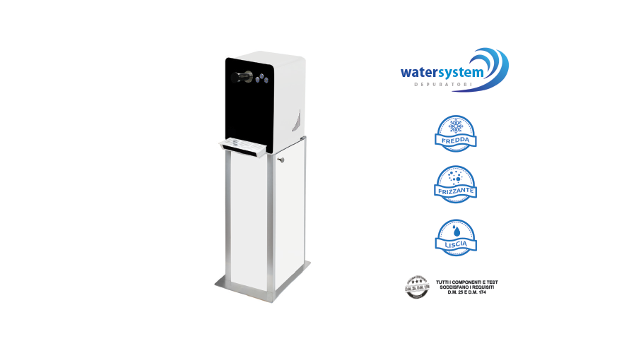 Colonnina free standing MF40 office per il settore ufficio, completa di erogatore per acqua frizzante e fredda e vano per ospitare bombole sino a 5 kg e gruppo filtrazione.